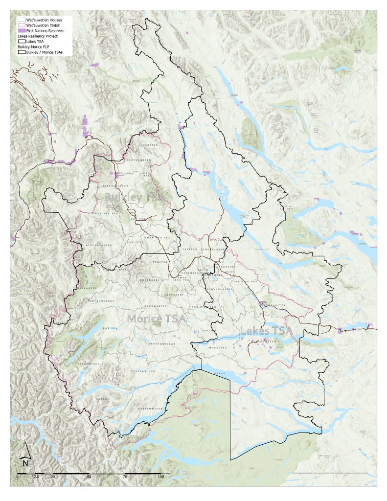 The Lakes Resiliency Project was started in 2019 in response to the devastating 2018 wildfires. The project area covers about 1 million hectares in north-central BC, and contains the headwaters of important tributaries of the Skeena and Fraser watersheds. It overlaps with the Lakes Timber Supply Area (excluding Tweedsmuir Provincial Park), and stretches from Babine Lake in the north to Ootsa Lake in the south.